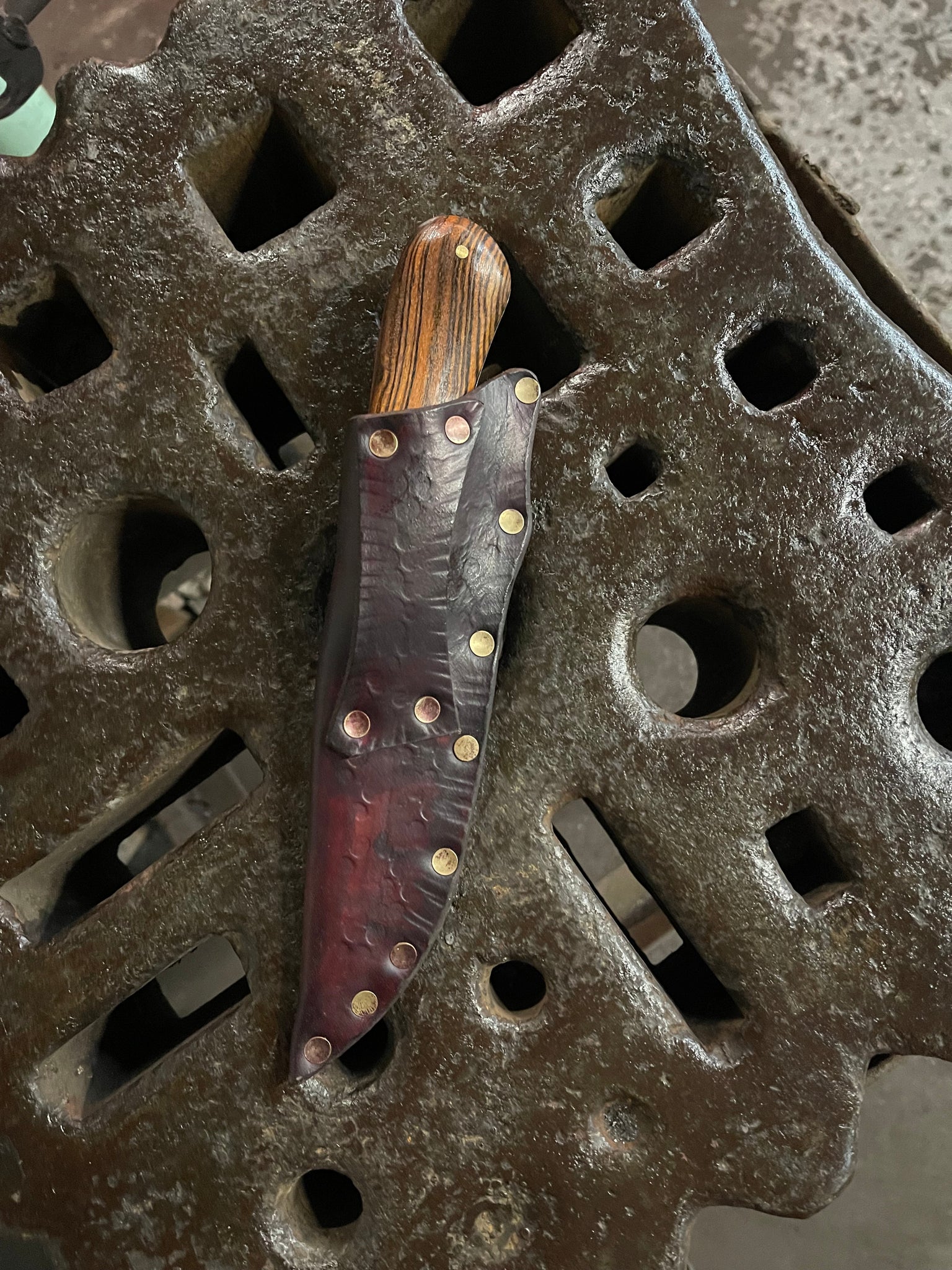 Sheath:  Mahogany Brown leather with antiqued brass rivets