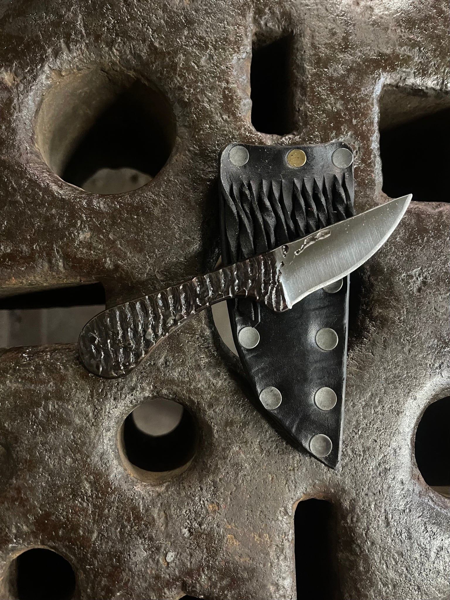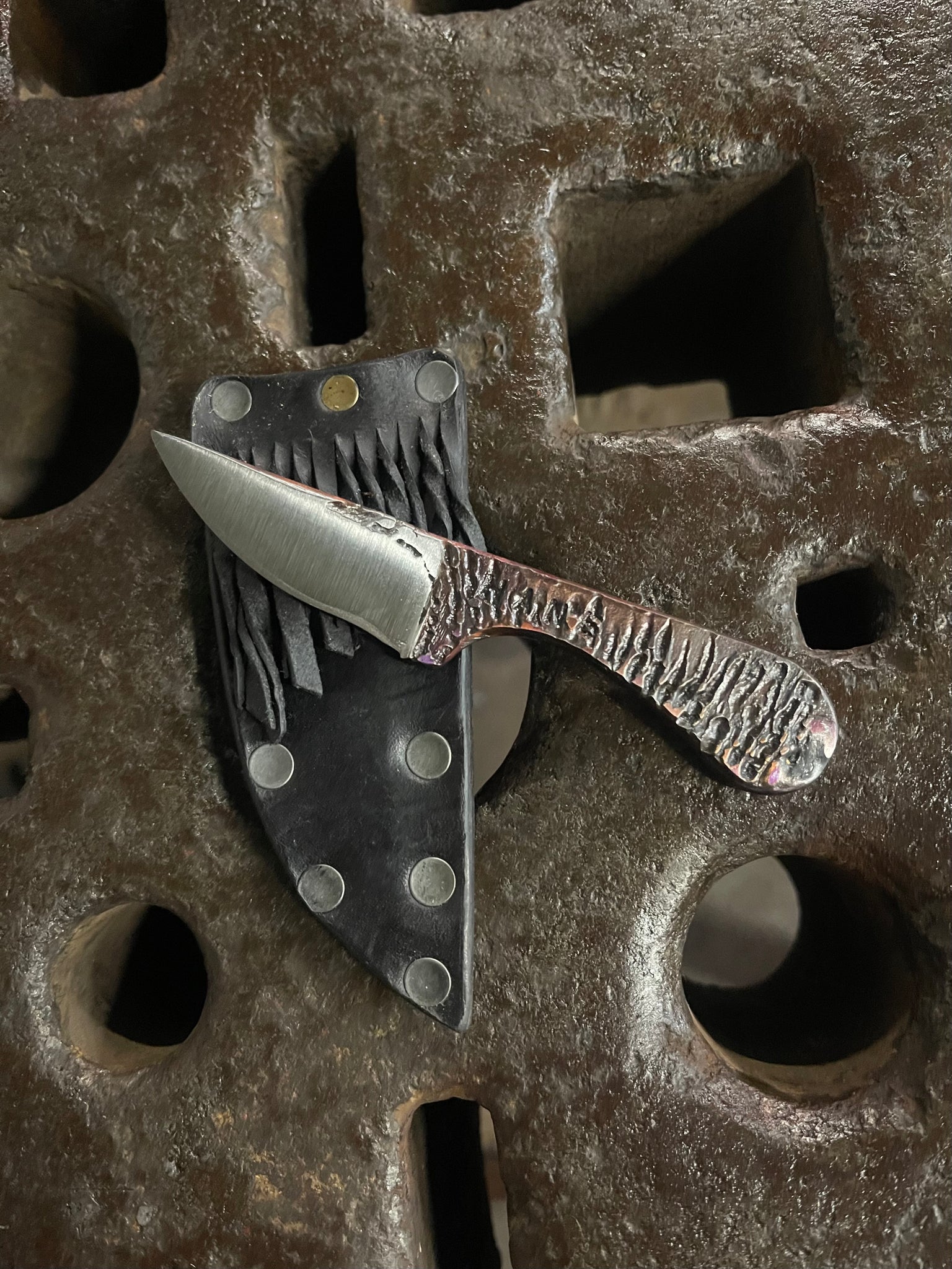Solid 80CRV2 fire textured knife! The Orc Fang is a wonderful friend. Usable in a variety of grips, it is a fantastic tool for everyday utility tasks for which you need a blade. The texture is created painstakingly with a fine tip brazing torch. It is both beautifully organic, and aids mightily in grip.