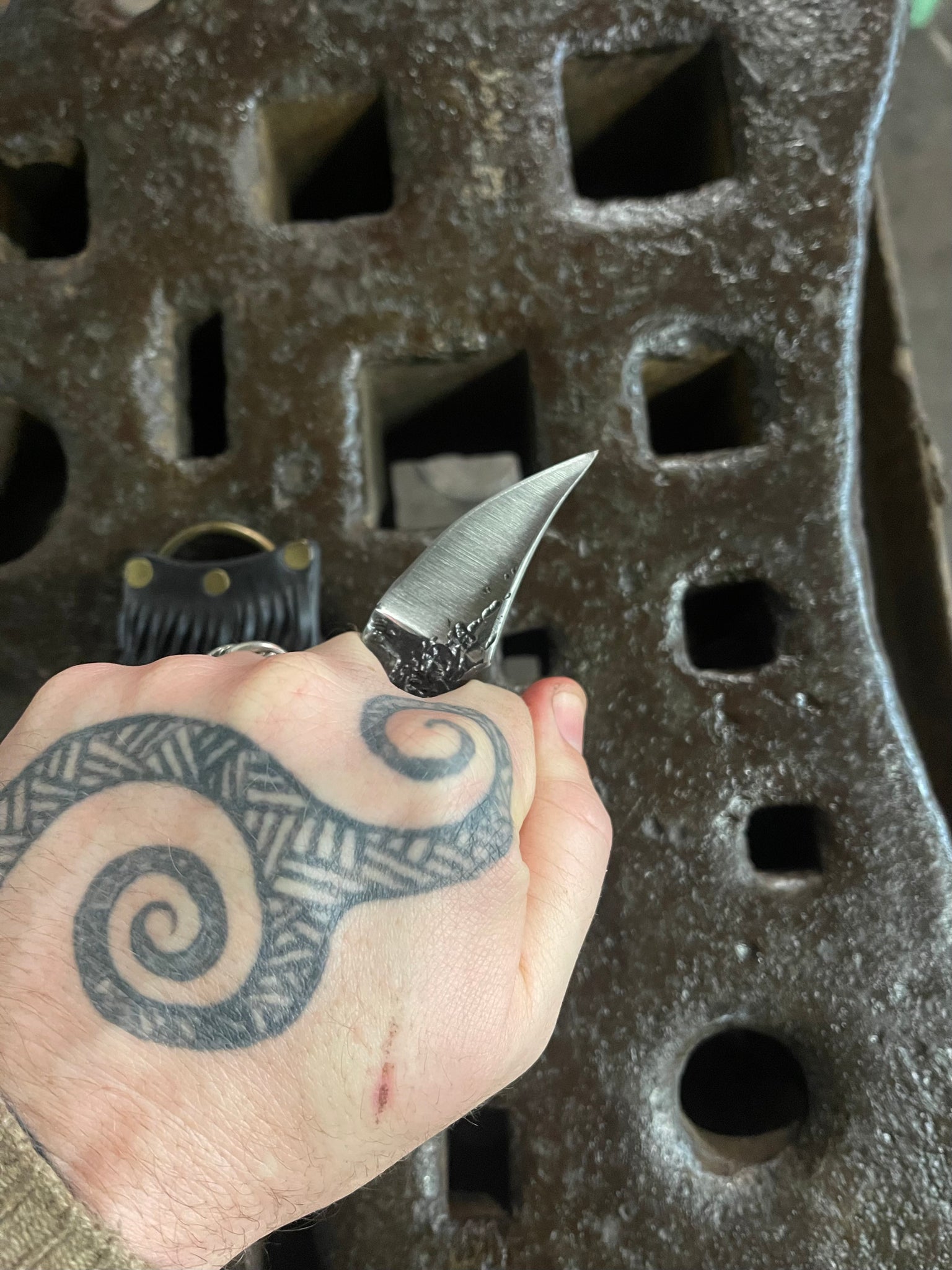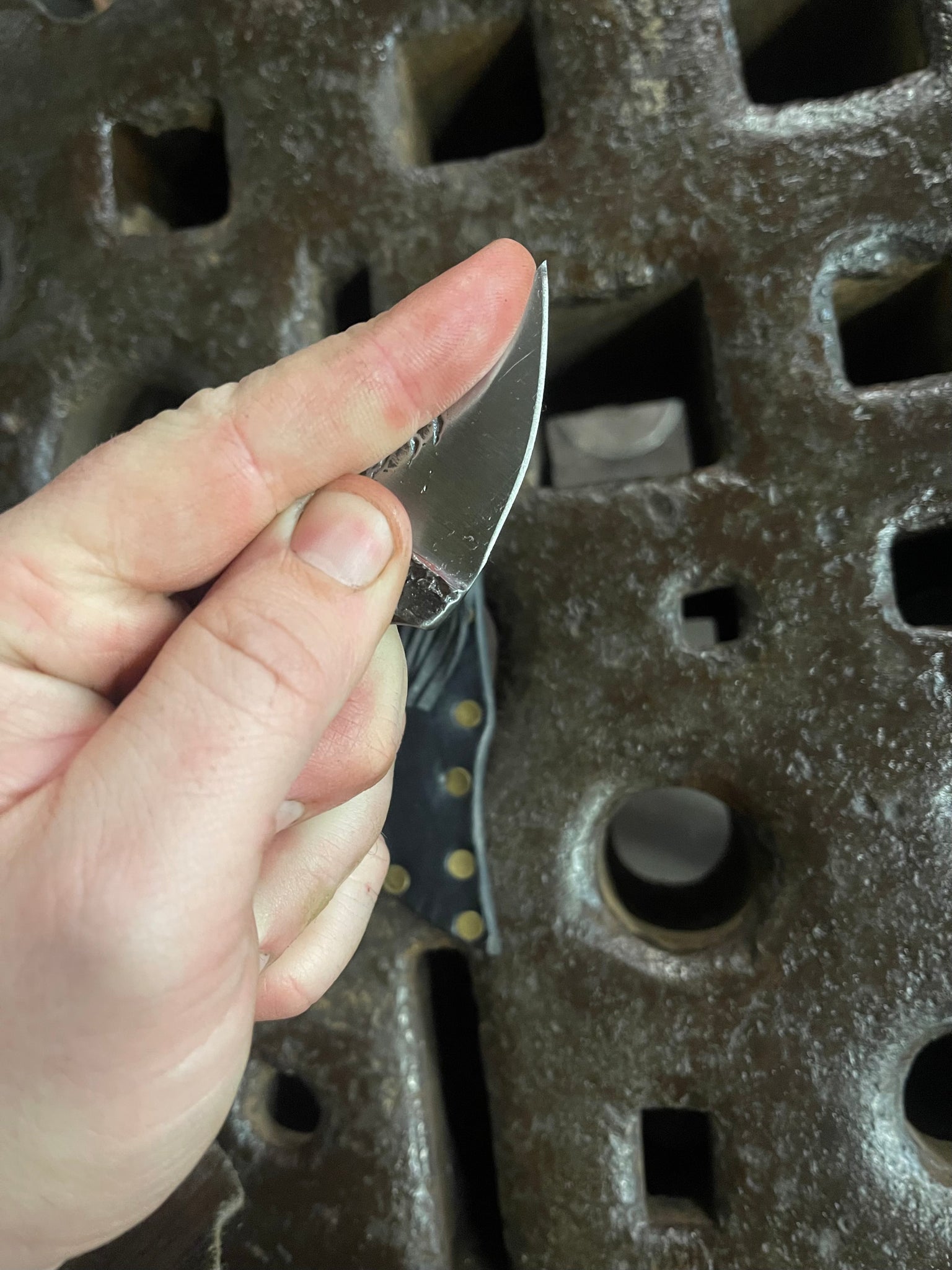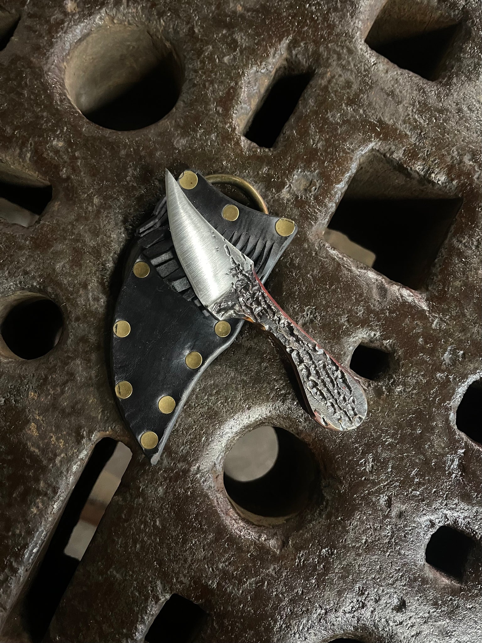 Solid 80CRV2 fire textured knife! The Raptor Talon is a wonderful friend. Perfect for skinning. Usable in a variety of grips, it is a fantastic tool for everyday utility tasks for which you need a blade. The texture is created painstakingly with a fine tip brazing torch. It is both beautifully organic, and aids mightily in grip.