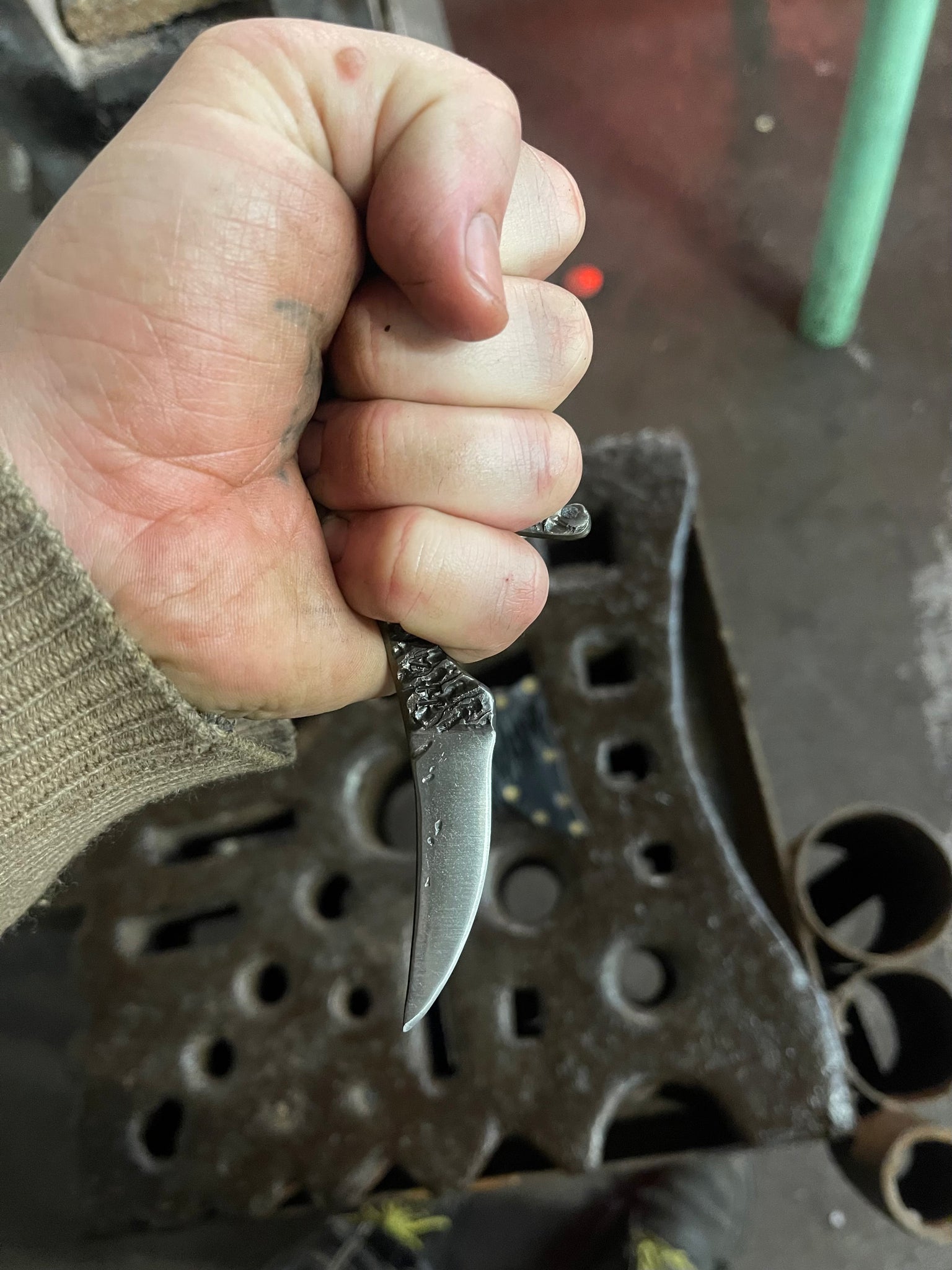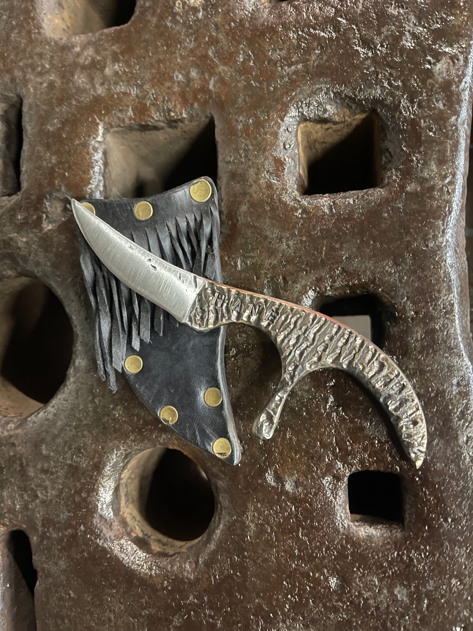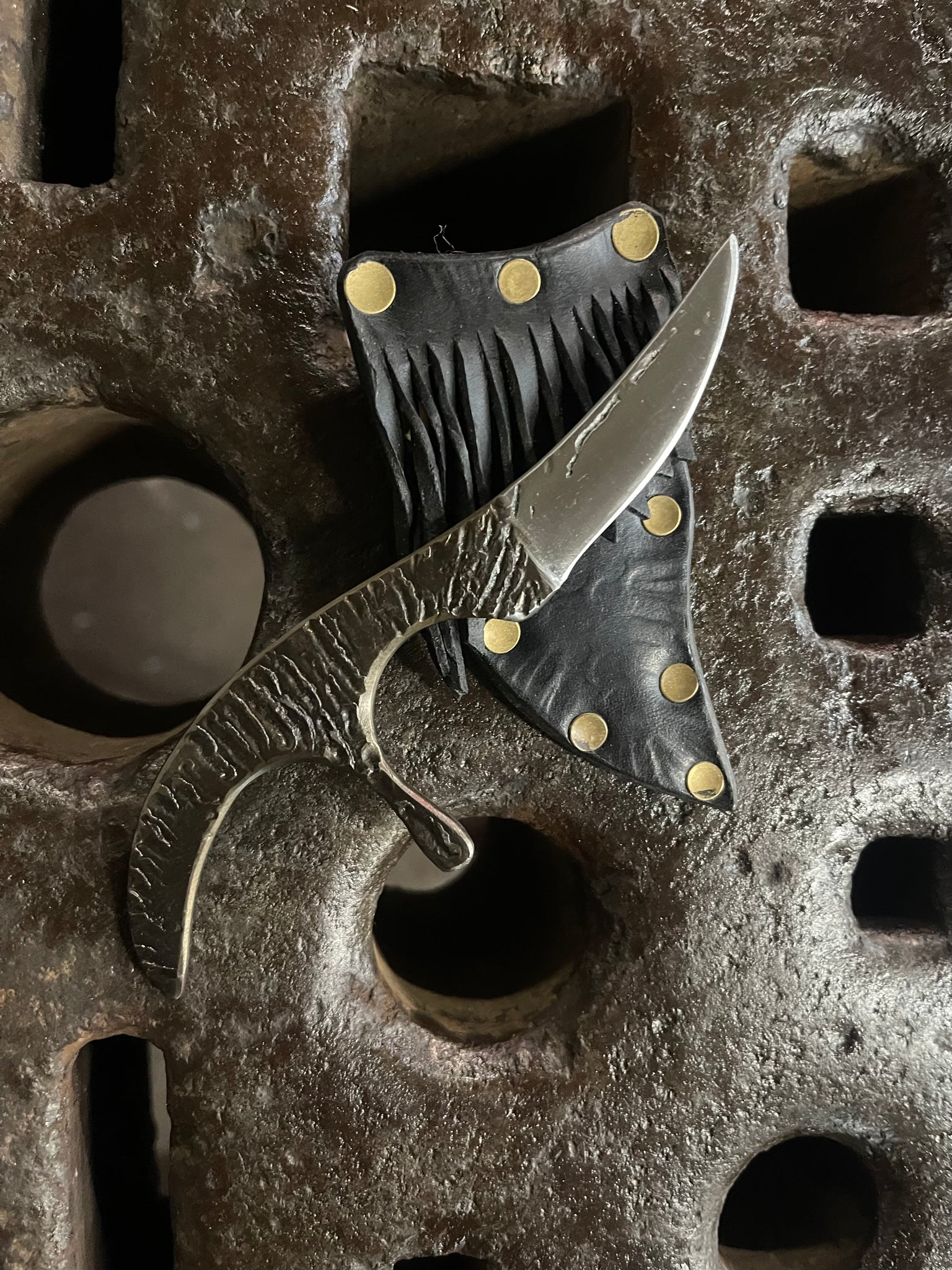 Solid 80CRV2 fire textured knife! The micro whale is designed for a broad variety of utilitarian tasks. It also has a fancy little spike that projects out between the fingers. Making it so that if you punch with it, the hardened steel spike hits first. The spike also doubles as an additional place for your fingers to grip for fine work and prevents slippage.