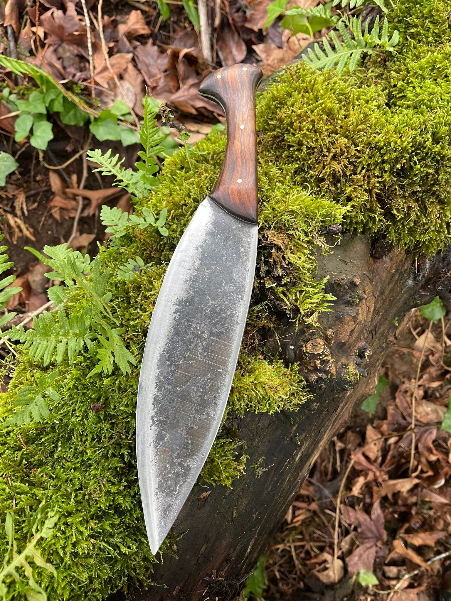 My large knives are usually on the thicker and heavier side, and I am delighted to have crafted a lightweight piece. This can be comfortably swung all day long. The flare the bottom of the handle ensures a solid grip that allows for a lot of force and momentum to be applied without worrying about slippage.