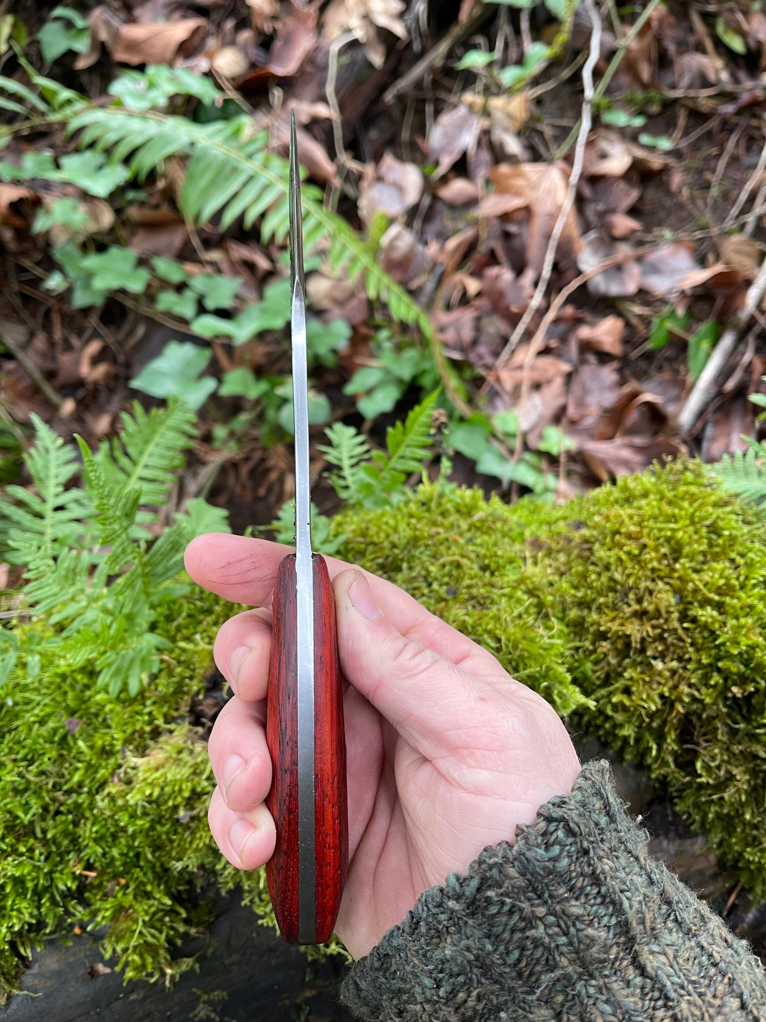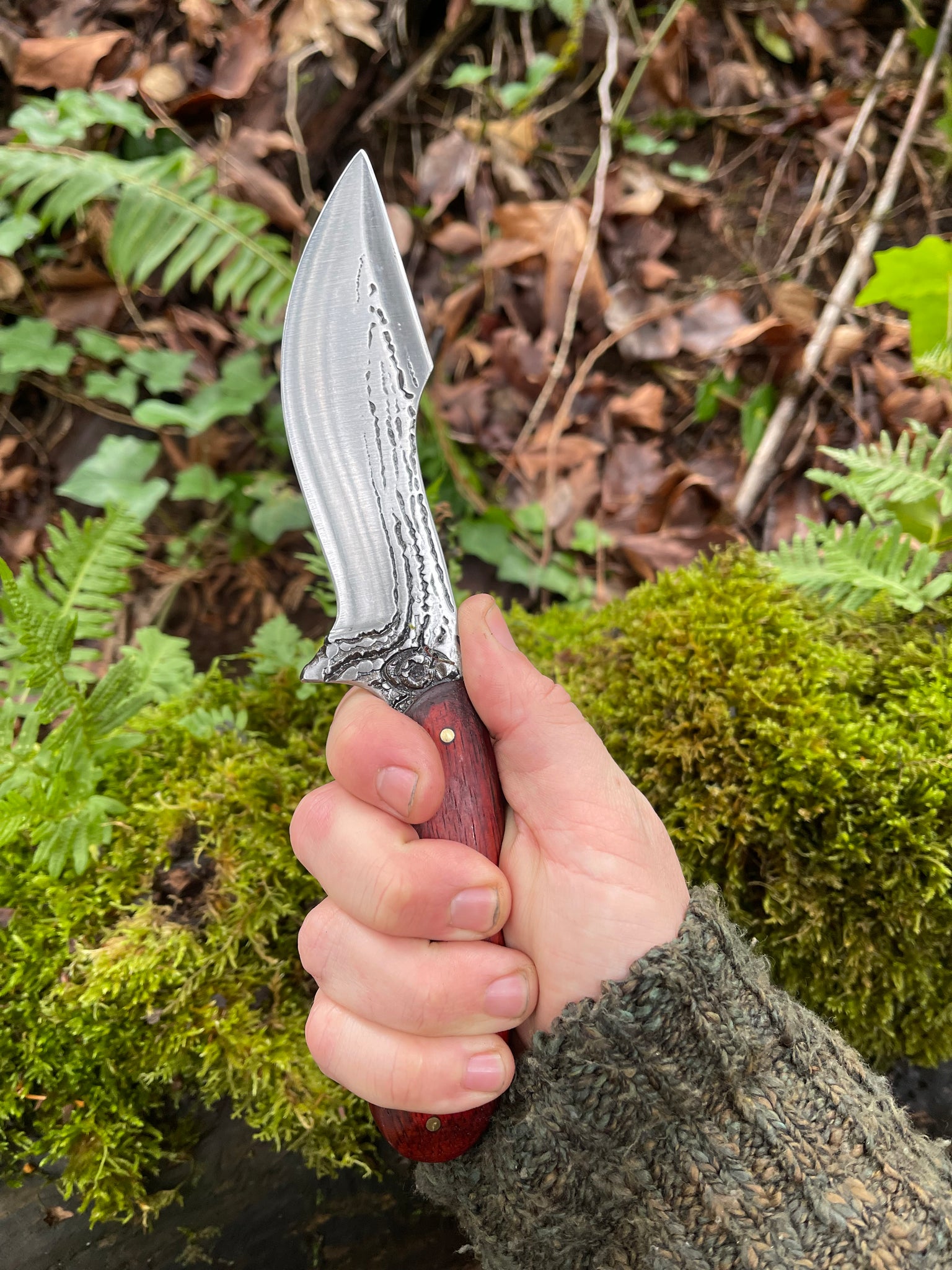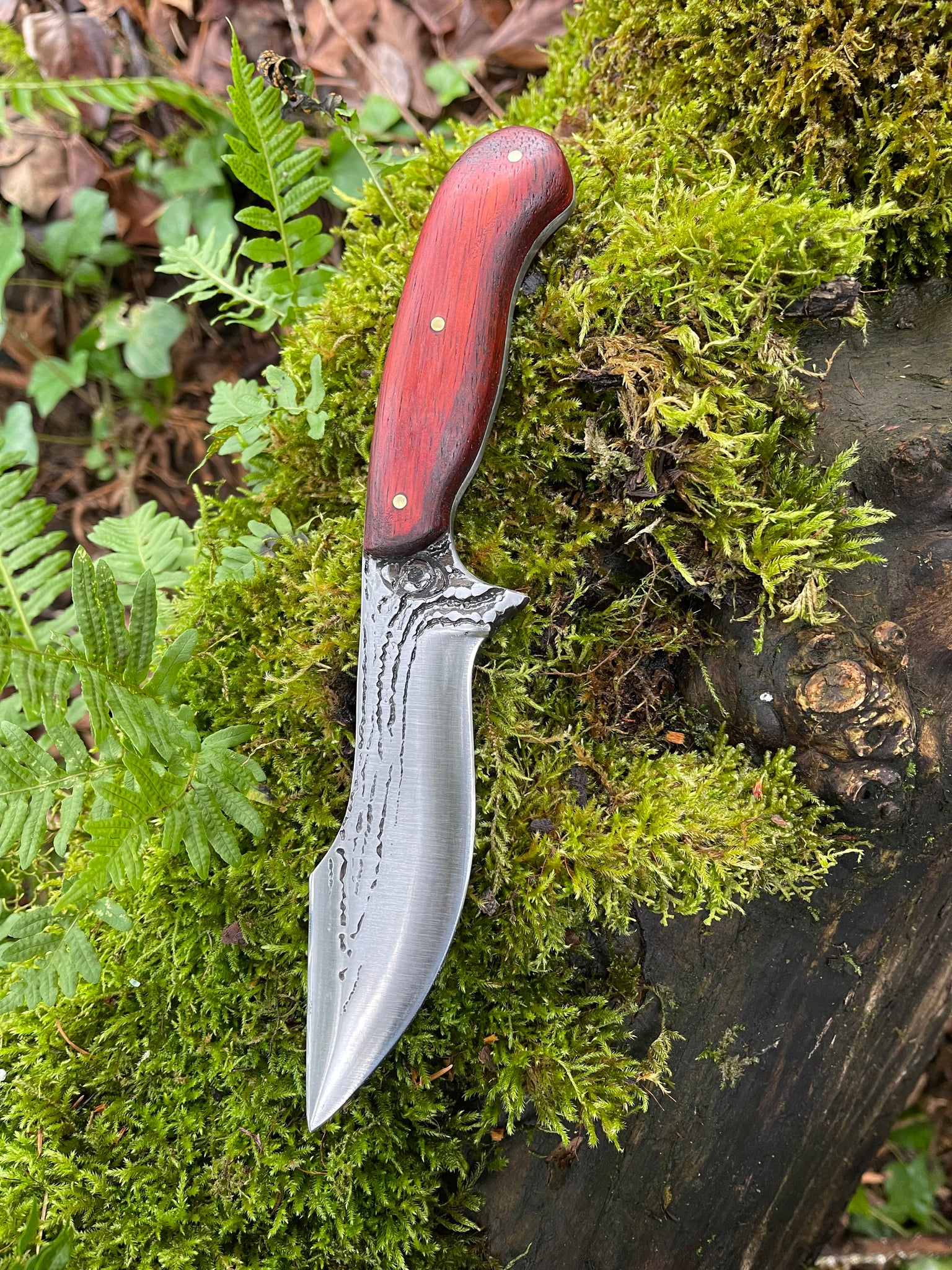 This is designed as a stylish and heavy duty all around utility and hunting knife. Thick enough to baton through a log or chop through a fresh femur. Sharp enough to delicately carve, skin and butcher.