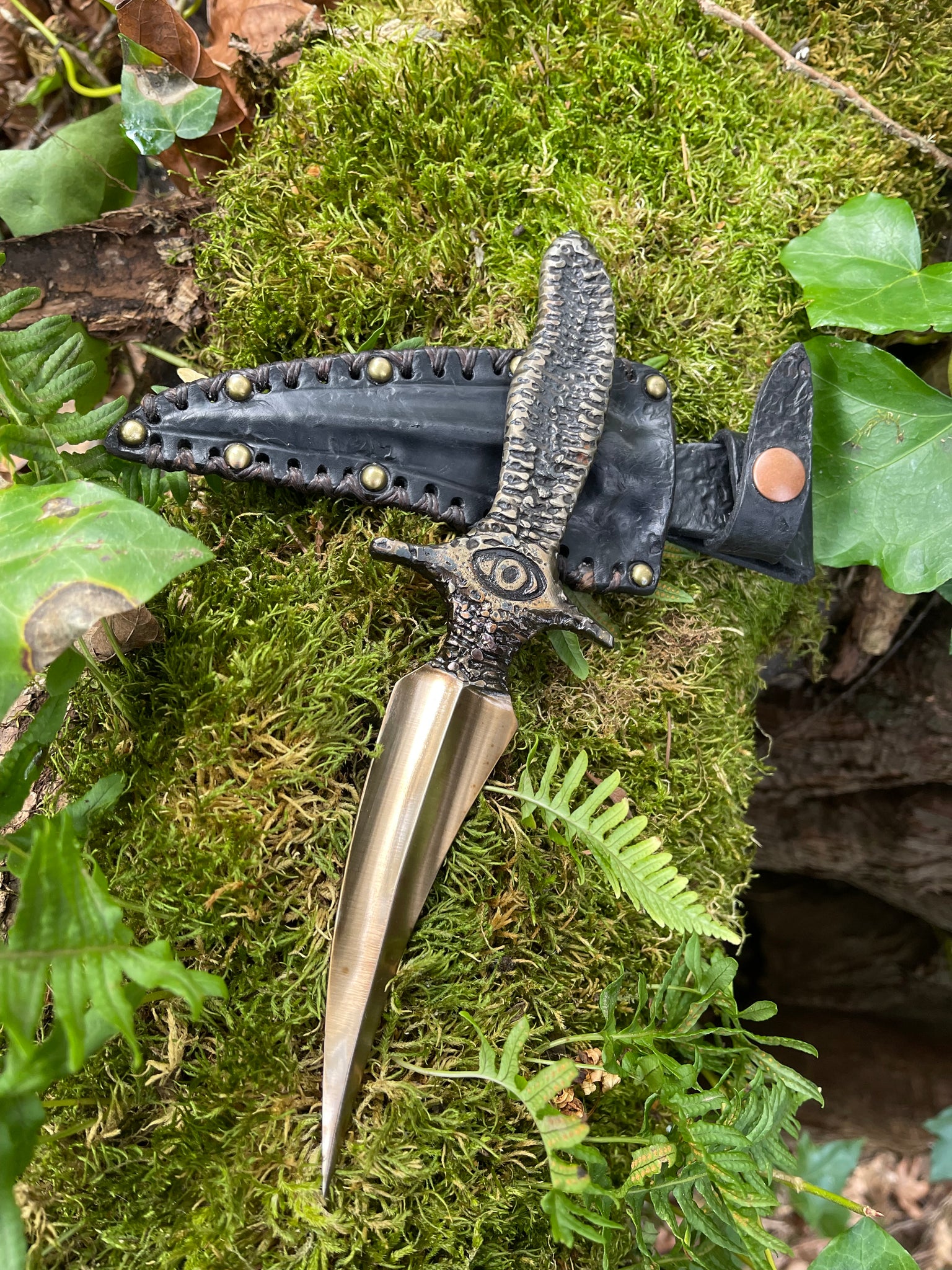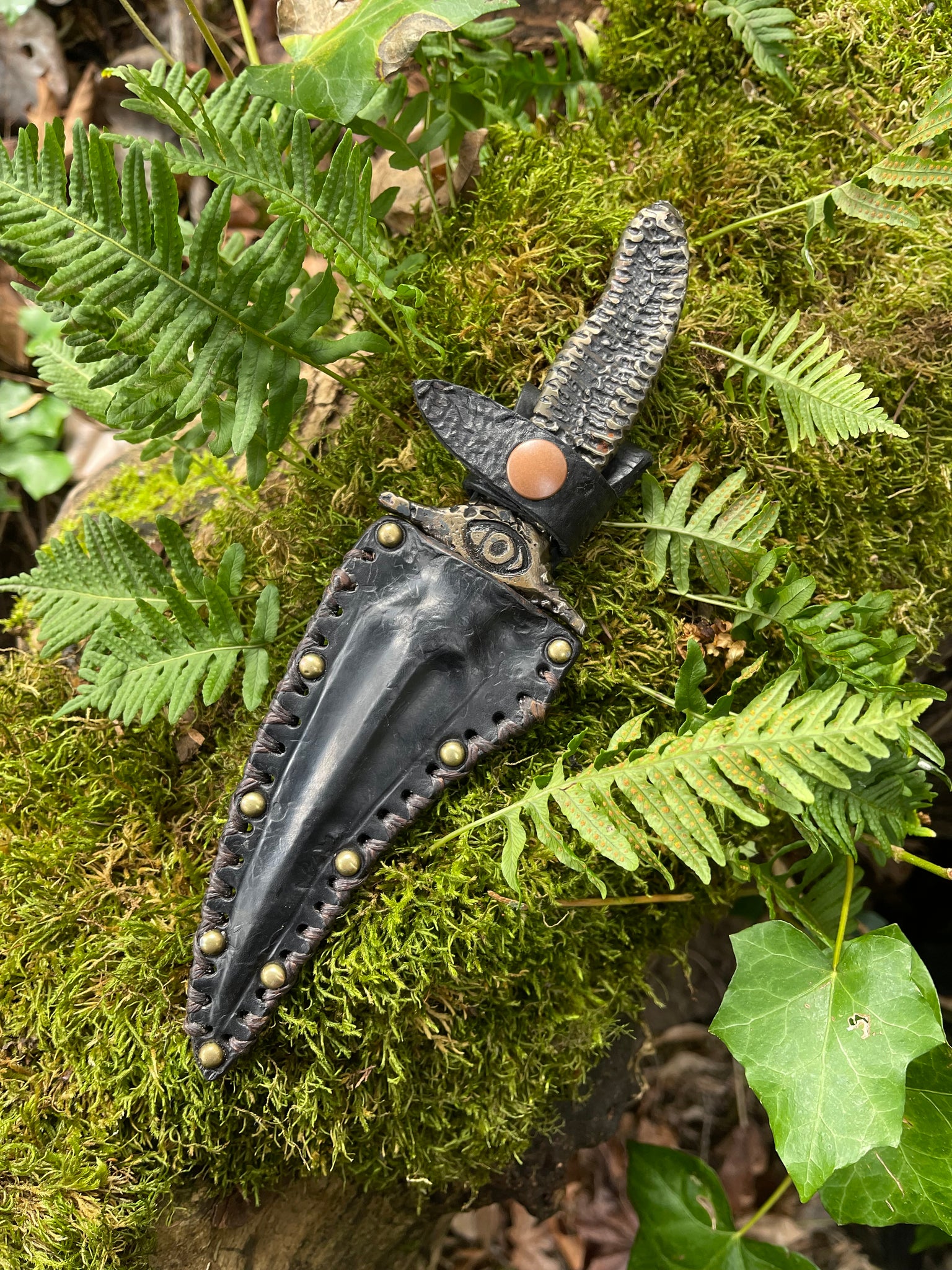 Sheath: Black wet formed leather with antiqued brass rivets, a retention snap, and hand stitching along the edge utilizing waxed artificial sinew cordage.