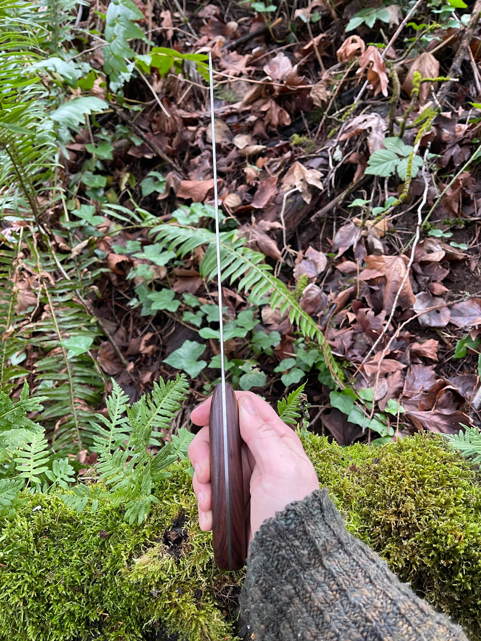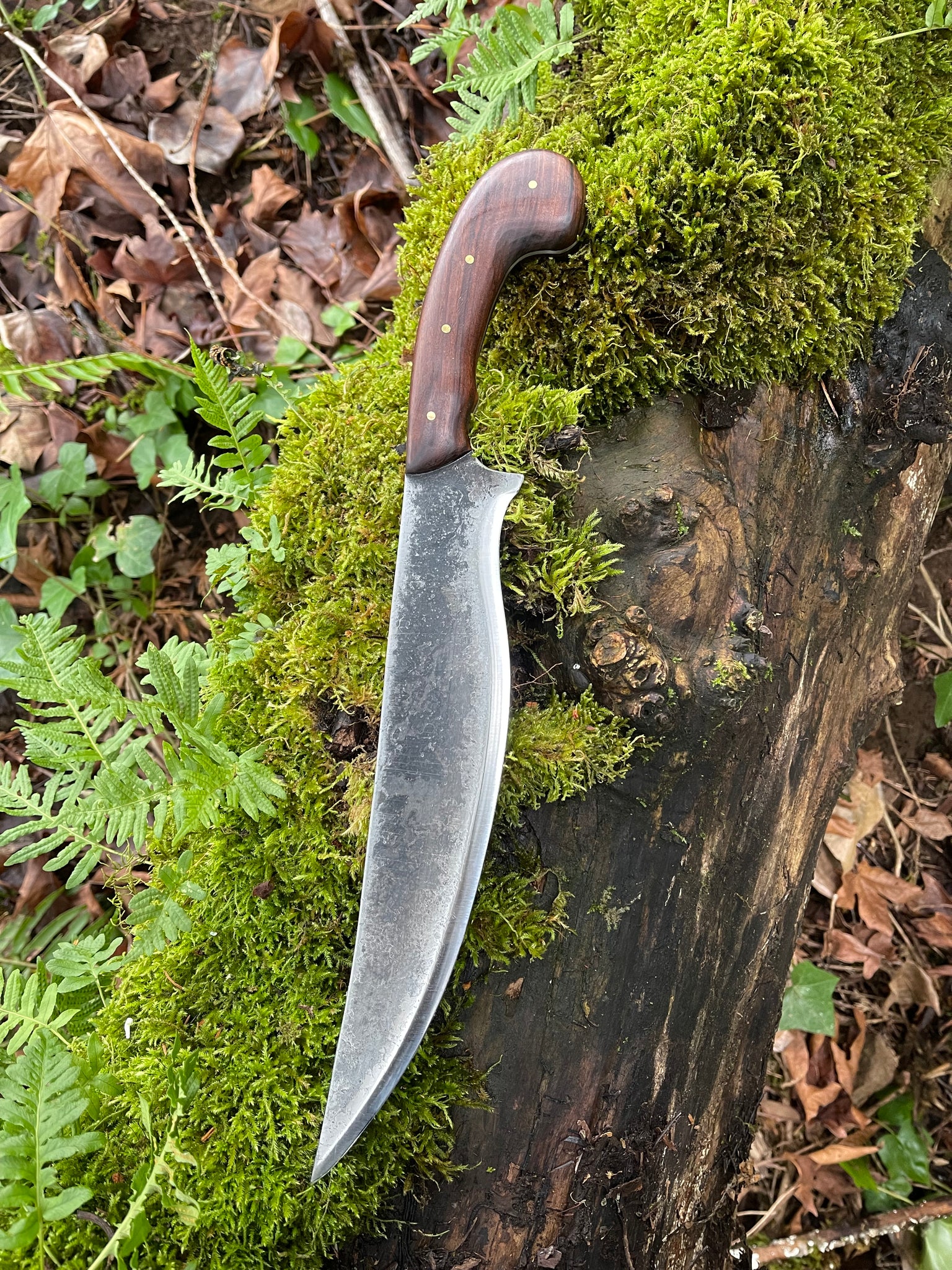 My large knives are usually on the thicker and heavier side, and I am delighted to have crafted a lightweight piece. This can be comfortably swung all day long. The flare the bottom of the handle ensures a solid grip that allows for a lot of force and momentum to be applied without worrying about slippage.