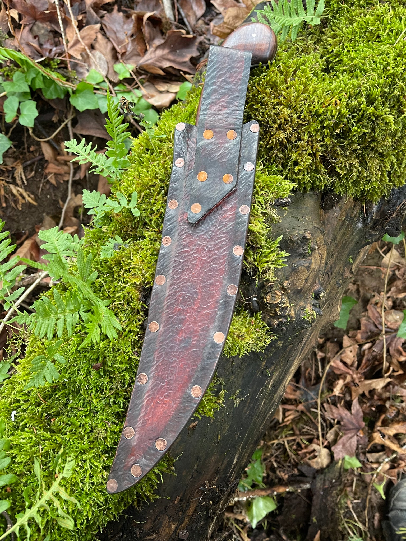 Sheath: Brown and black leather with antiqued copper rivets