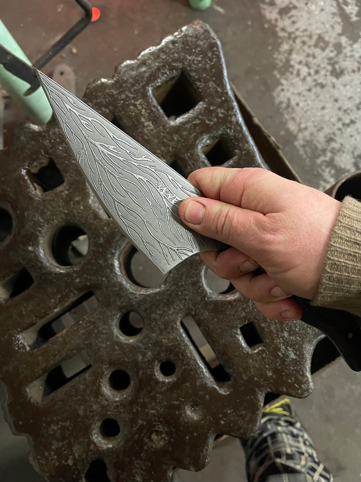 The design on the blade is hand painted on, then acid etched deeply enough that you can feel it when running a finger over the flat of the blade.
