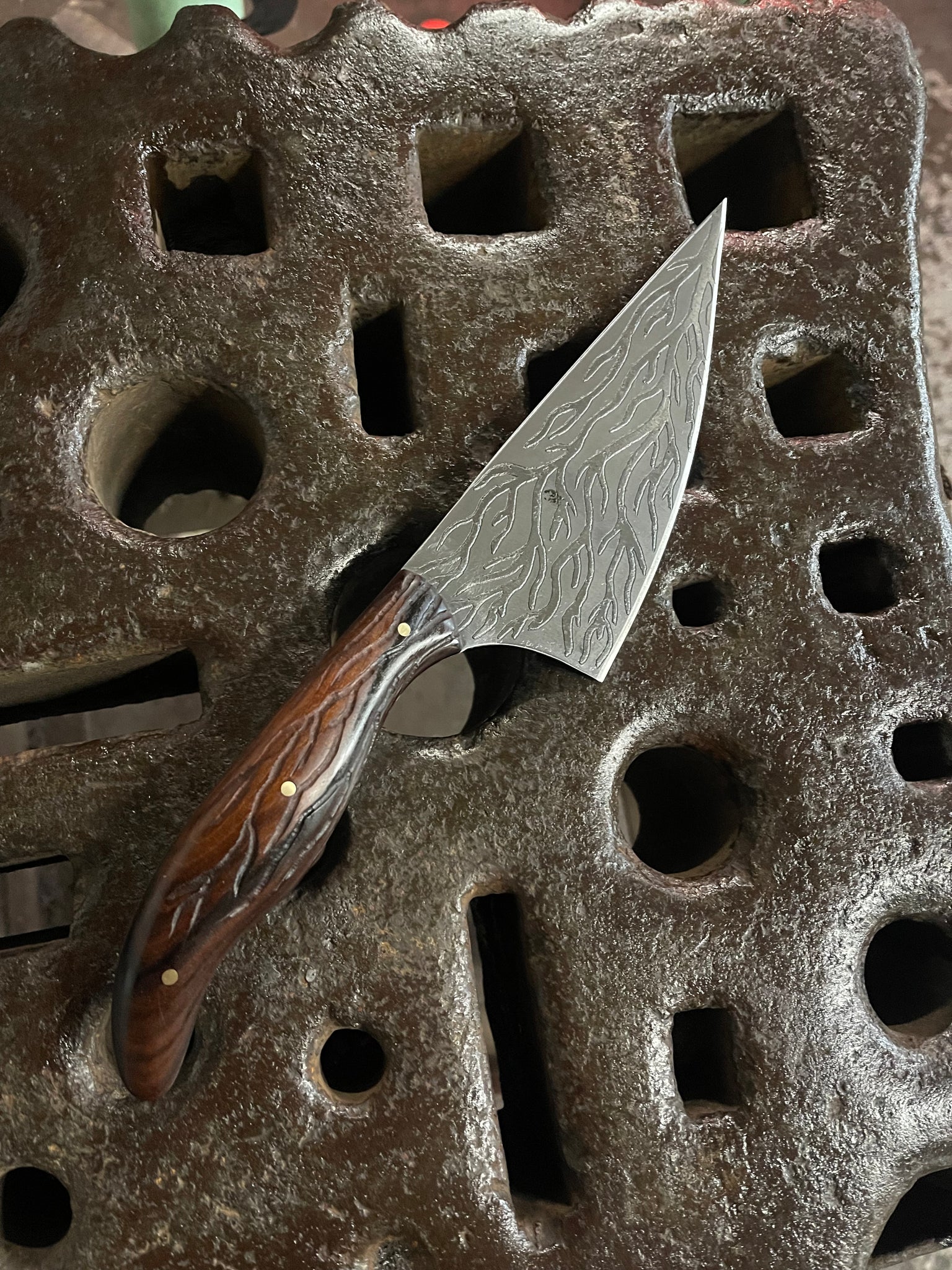 *AVAILABLE* Fancy Dancer Chef's knife with Mycelium etching and carved Morado handle.