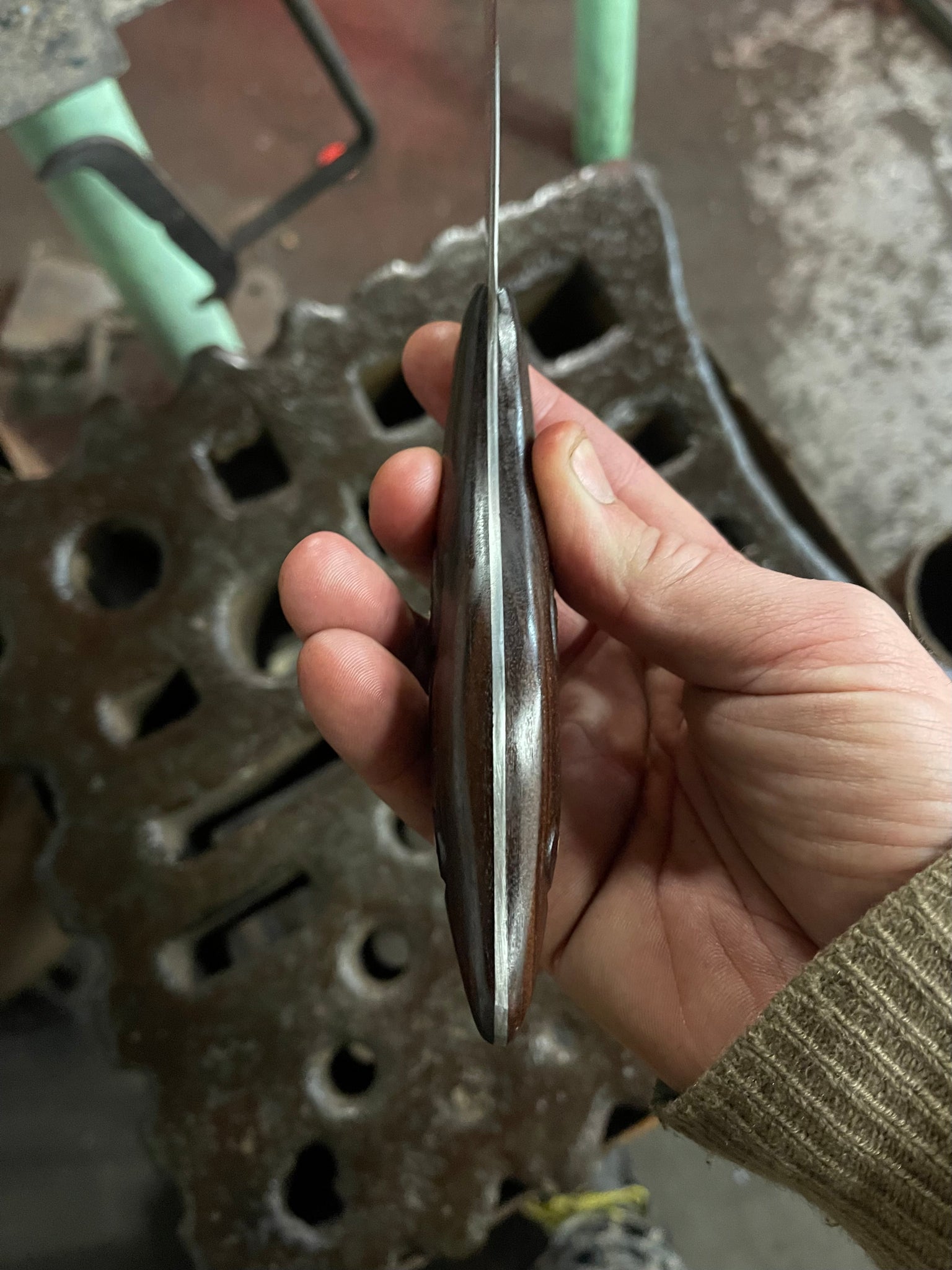 The Elegant slicer is a new design from my forge. It was created to facilitate your hand being in a pinch grip intuitively and effortlessly. The blade profile is optimized for push cutting, slicing, rock chopping and dicing. Very multipurpose. The designs carved into the handles both enhance grip, and let the design elements of the blade flow down for a cohesive design.