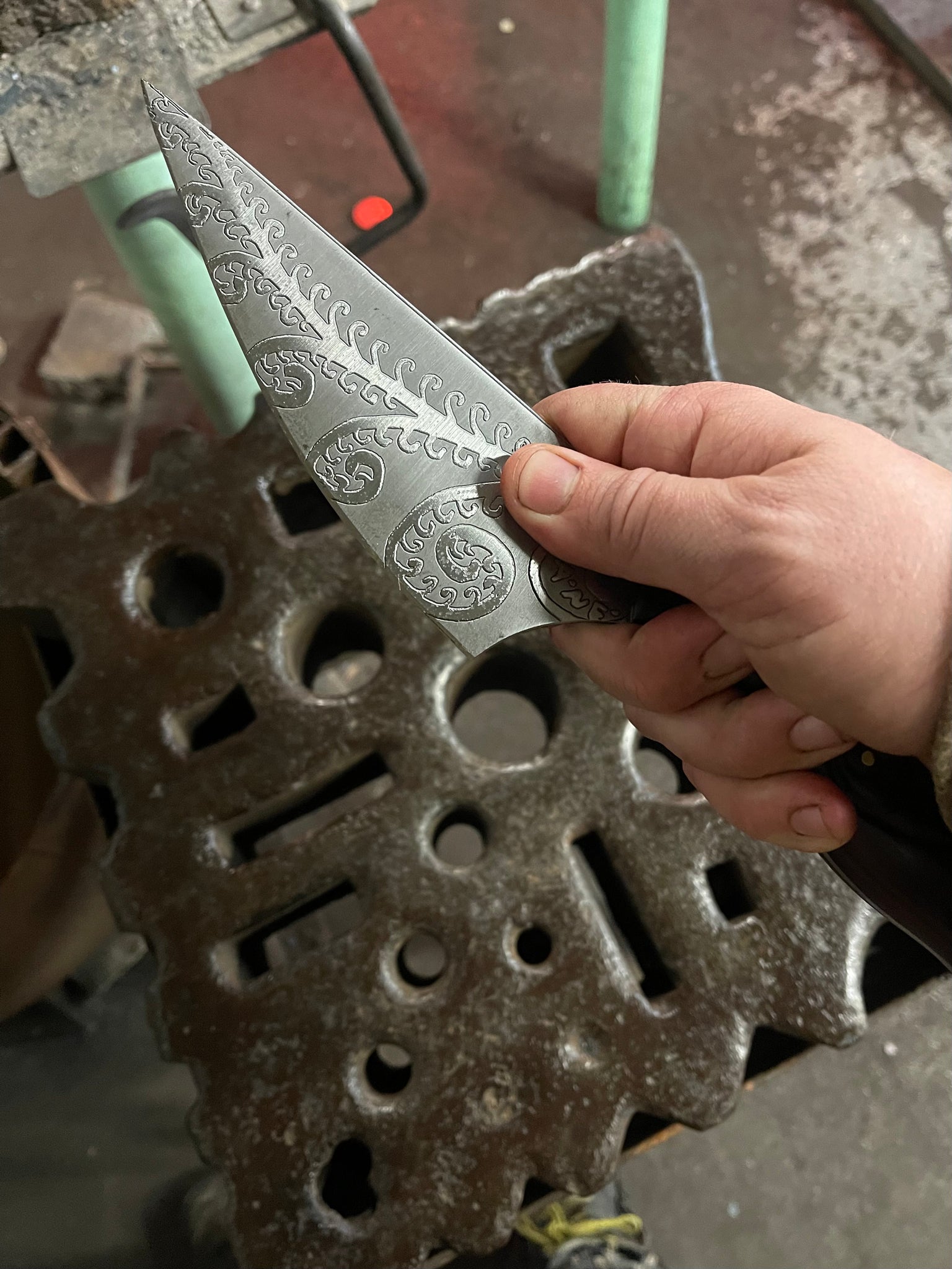 The design on the blade is hand painted on, then acid etched deeply enough that you can feel it when running a finger over the flat of the blade.
