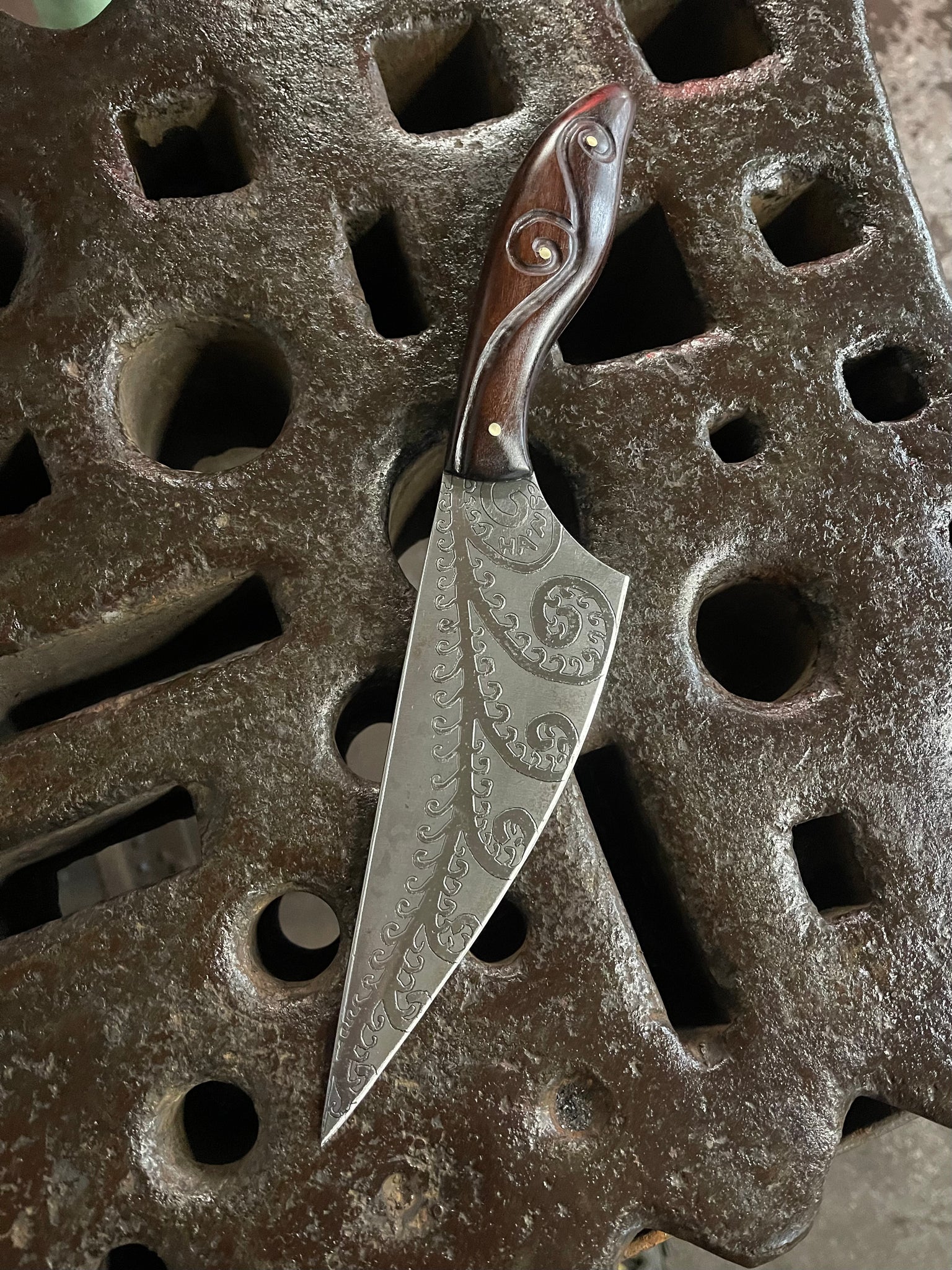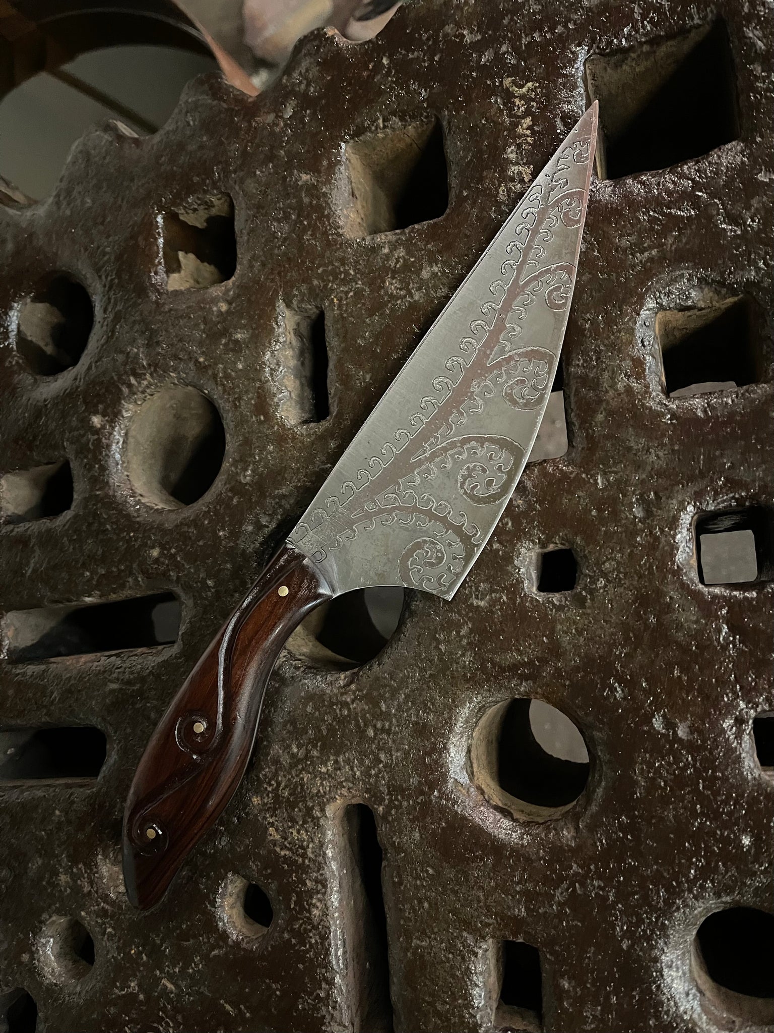 *AVAILABLE* Fancy Dancer Chef's knife with Fiddlehead fern etching and carved Morado handle.