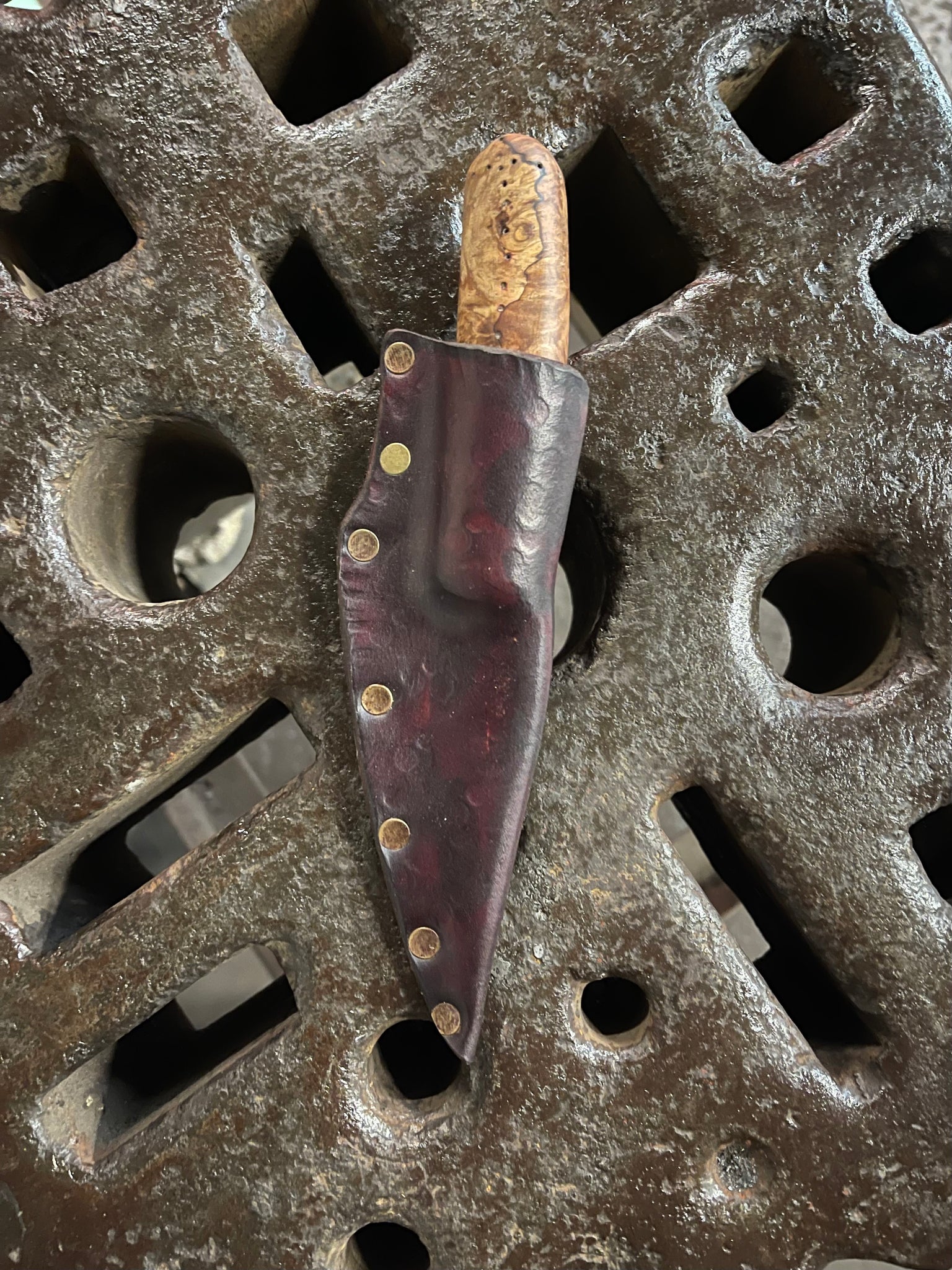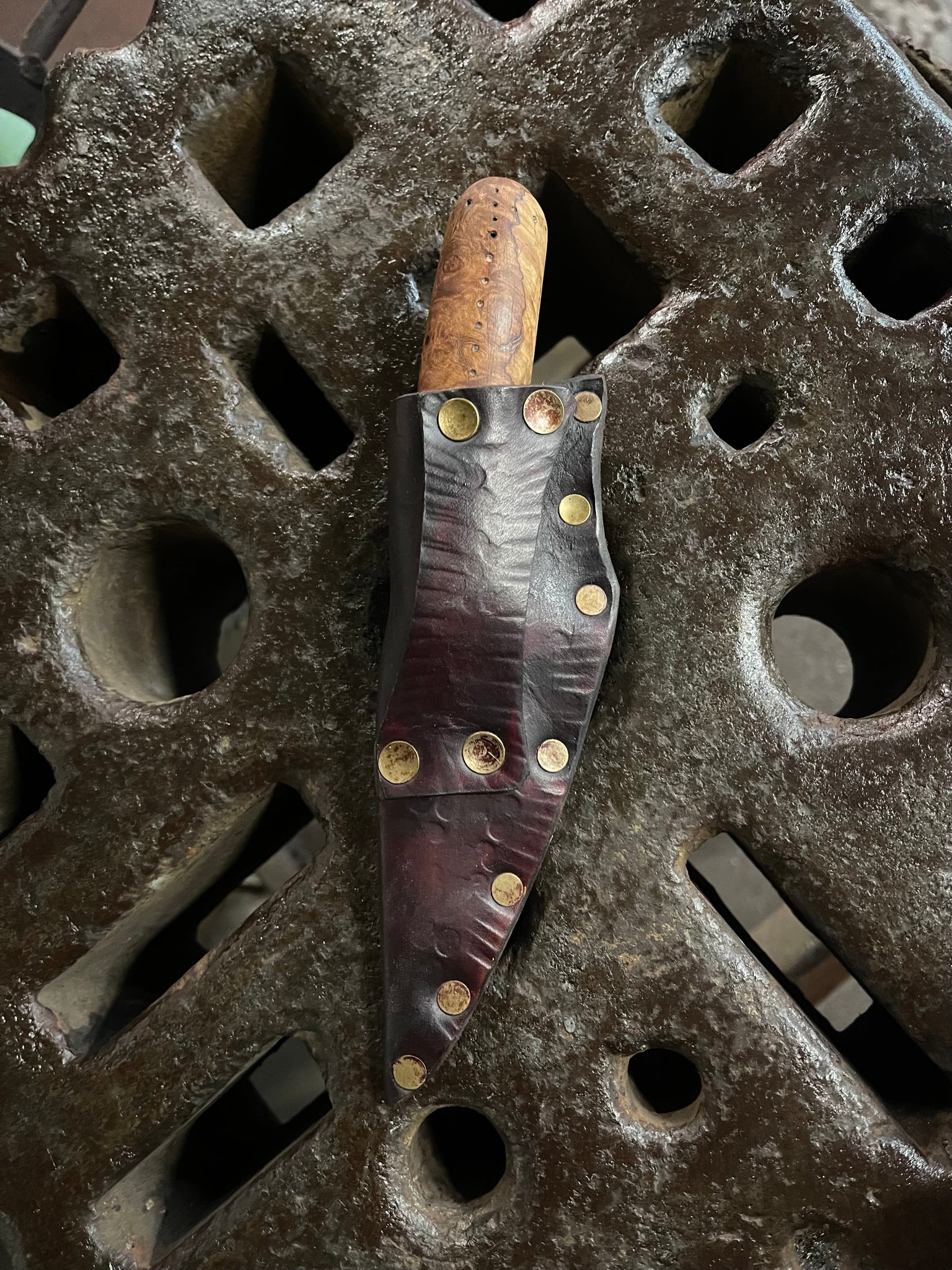 Sheath: Mahogany veg tanned leather and antiqued brass rivets